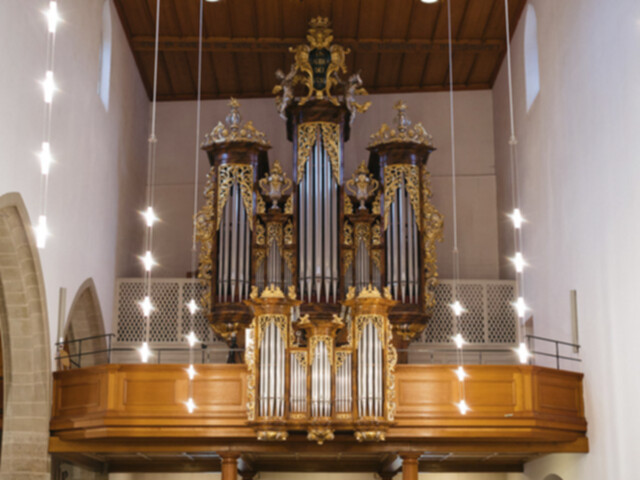 1962 wurde das vom damaligen Organisten Ernst Gerber initiierte und geplante Instrument durch die Orgelbaufirma Kuhn AG hinten im Westen der Kirche auf der Empore eingebaut. Ihr schlanker wunderbar abgerundeter Ton und ihr transparentes Plenum passen akustisch ideal in die Raumproportionen der Stadtkirche. Sie umfasst insgesamt 4493 Zinn- und 192 Holzpfeifen, und verfügt über 61 klingende Register, vier Manuale und ein Pedal.